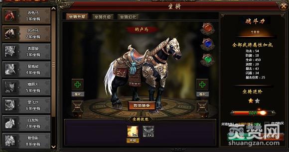 游戏王国《霸将三国》里坐骑只有一种,通过不断进阶二改变造型,提升属性,坐骑可以升星,可以升级,也可以幻化,升星意思就是进阶,每个阶段升到五星就会进阶成下个级别的坐骑,一共有10个级别,坐骑还可以吃属性丹,踏云丹,主峰丹,追月丹,增加三围,攻击,防御,速度,闪避,暴击和生命属性,每进阶一级,就会增加吃属性丹的上限,坐骑本身也永久增加这些属性,坐骑也有5个技能,每个阶级的坐骑低有5个技能,没升一星就激活一个技能,这些技能可以通过一些材料升级。坐骑升级只需要坐骑经验丹就可以了,坐骑等级越高属性加的越多。