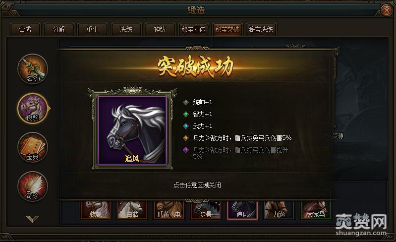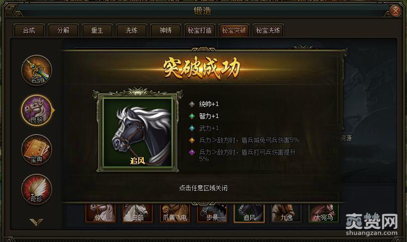 今天我们先依次选择锻造-秘宝突破-良驹-第五匹良驹追风,进行突破吧。
