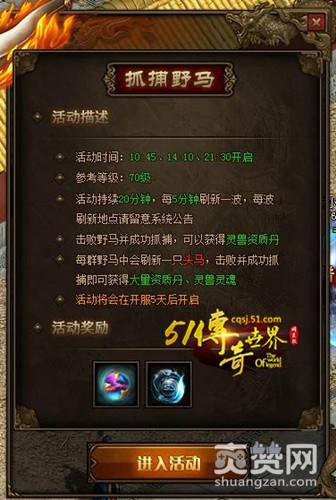 51《传奇世界》抓捕野马活动在开服5天后的10:45、14:10、21:30开启,只要等级达到70级的玩家即可参与,活动持续20分钟,每5分钟刷新一波,击败野马并成功抓捕,可以获得灵兽资质丹,每群野马中会刷新一只头马,击败并成功抓捕即可获得大量资质丹、灵兽灵魂。当然,要想百发百中,是需要掌握技巧的,攻击野马使野马低至一定血量并且成功捕捉,可以获得灵兽资质丹,击败不同种类的野马或者捕捉野马,获得的灵兽资质丹的品质各不相同,要想获得大量的资质丹,灵兽灵魂,那就撸起袖子瞄准头马吧!
