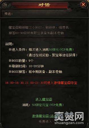 萝卜玩《传奇皇朝》在每天16:10-16:40这个时间,藏宝阁的大门就会打开,巨大的宝藏便静静地等着各位玩家,达到一定等级的玩家便可进入争夺。