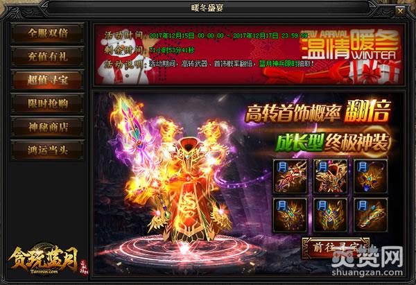 兄弟,天冷注意保暖!《贪玩蓝月》暖冬盛宴时隔多日再次开启,从12月15日至12月17日,为你点燃冬天里的一把火。双倍经验,只限一天,升级蹭蹭上涨;充值返好礼,每天只需20元,再领价值388元大礼包;寻宝概率翻倍,高转首饰,蓝月神兵助你冬天手气依旧火热;特惠极品材料特价限时出售,不是何人何时何地都想买得到;幸福数字大竞猜,只需小额元宝,便可单车变超跑。《贪玩蓝月》暖冬盛宴已经开启,就等你来参与了。