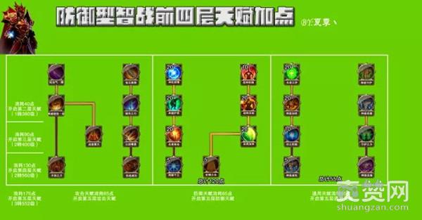 智战技能效果多以增加全队HP上限,保护队友,同时削弱对手防御/攻击为主。所以作为承受大部分伤害的角色,智战前期加点方向,主要是以防御为主。而后期则主要以提高自身生存为主,值得注意的是,因为智战第五层天赋开启需要消耗175点天赋,比智弓少10点,而防御天赋加满,以及通用天赋加满左侧,刚好可以满足需求。