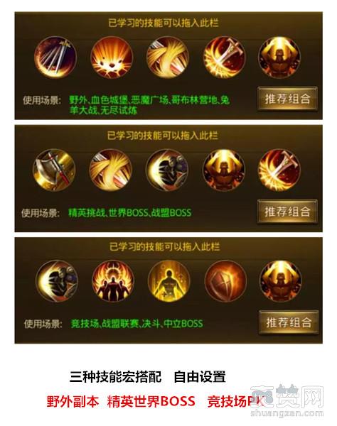 点完天赋,角色已掌握的技能十分丰富,37《大天使之剑H5》一共提供了副本野外挂机、精英世界BOSS挑战、竞技场PK三种不同场景的技能宏方案。所以,我们可以根据技能属性合理设置技能,以便在不同场景取得战局优势!