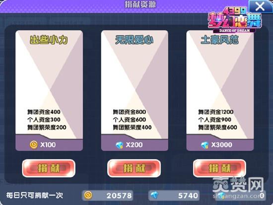 玩家可以通过捐献获得个人的资金,并提升舞团繁荣度和舞团资金,捐献有三个档次,每个档次的消耗和收益都是不一样的,需要注意的是,每天每个人只能捐献一次,捐献过了就不能再操作了。