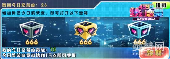 玩家通过捐献提供繁荣度后,当繁荣度达到一定数额时,可以领取舞团工资,如果舞团当天所有的繁荣度都达到一定标准,则可以领取额外的宝箱。