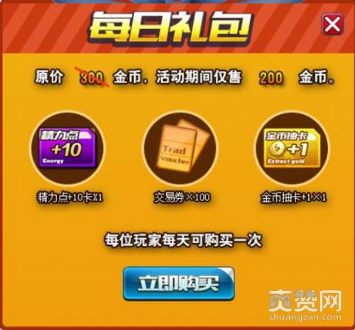 礼包内含精力点卡+10X1张、交易券100张及金币抽取次数卡+1 X1张。仅售200金币!每个玩家每天限购买一次!