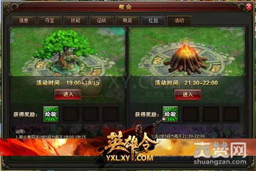 除了夺宝、征战,XY游戏《英雄令》帮会成员互动当然也不能少啦!每天19:00至19:15分,XY游戏《英雄令》将开放帮会神树活动地图,帮会成员为神树浇水、除虫可提升神树等级,增长帮会经验!众人植树士气高,众人添柴火焰高!辛苦了一天,不如来场篝火晚会把酒话温情!每天21:30至22:00,XY游戏《英雄令》帮会篝火晚会都会准点开启,帮会成员只要参与晚会即可获赠海量经验,更可请酒其他成员增加互动乐趣哦!