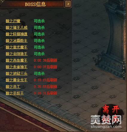 藏宝阁内有12个BOSS以及其他怪物,未击杀的BOSS显示可击杀,已击杀的BOSS则显示刷新时间,右下角有离开副本按钮。