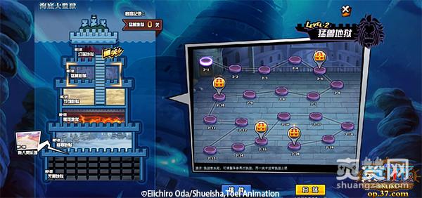 和原著中一样,37《航海王OL》游戏中大监狱一共有6层。从红莲地狱到无限地狱,每一层都有若干关卡,玩家从第一层开始逐一闯关,每通过一关都可以获得相应的奖励。每通过5个关卡会获得一个宝箱,宝箱内含有丰富奖励。