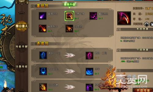 进入51《鬼吹灯之牧野诡事》后,玩家可以通过主界面的武学按钮可以打开武学界面,在武学界面可以学习并升级强大的技能。每个职业有12个可用的主动技能,分为基础技能和连续技2类,基础技能为没有施放前置条件,怒气或内力足够即可施放,连续技必须按照顺序进行施放。