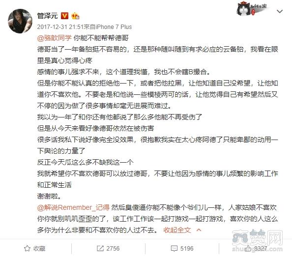 而后他更反过来指责记得,痛骂他:「臭傻逼你能不能像个爷们儿一样,人家姑娘不喜欢你你就别叽叽歪歪的了,该工作工作该一起打游戏一起打游戏,喜欢你的人这么多你为什么非要和不喜欢你的人过不去。」对此记得回应表示:「所有的事情因为我而起,我幼稚的感情观跟不成熟的方式总是在伤害我很在乎的人。感情的事情,我喜欢她,都是我自己硬要这么做的,并不是她吊着我,或者利用我什么的。真的,我就是那种自以为追求很浪漫而不可自拔的戏精,身边的朋友站在我的立场觉得我太傻逼劝不了,然后产生了误会。感情是私人的事情,我不配做一个公众人物,真的不希望任何人再自己猜测剧情然后下评断了。我告诉你们所有的故事,就是我是个大傻逼,因为自己的优柔寡断,让我的喜欢变成了最恐怖的伤害,我恳求你们相信我这件事情就是很单纯的我喜欢她,但她不喜欢我,没有任何其他的然后了。错的是我,非要当个矫情的傻子,任何女生被我追求都会很痛苦的,我活该单身的,真的,这件事情能不能就停在2017了,我真心诚意地拜托你们。」更表示自己新年新目标是争取中国赛区最受欢迎的解说,也希望粉丝不是透过这些花边新闻认识他的。