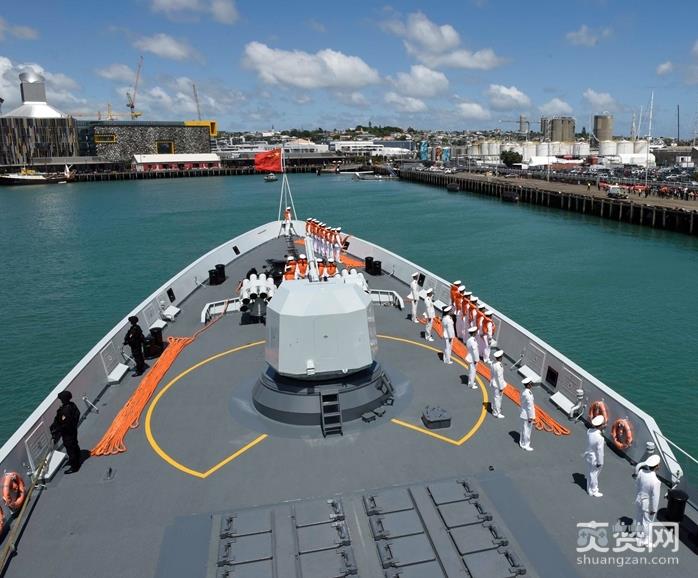 上午8时30分,受邀参加新西兰海军成立75周年国际舰队检阅活动的各国舰艇开始组成航渡队形,盐城舰在新西兰特玛纳号护卫舰的引导下进港。特玛纳号护卫舰代表进港舰艇编队与新西兰信号台分别鸣放礼炮,欢迎编队到访。盐城舰挂起中国、新西兰两国国旗和代满旗,舰员身着洁白军装在甲板上分区列队。新西兰在奥克兰温耶德码头为盐城舰举行了隆重的欢迎仪式。中国驻新西兰总领事许尔文、武官李景峰以及当地华人华侨、中资机构代表200余人到码头迎接。盐城舰此次靠泊奥克兰,主要是为了参加庆祝新西兰海军成立75周年国际舰队检阅活动。