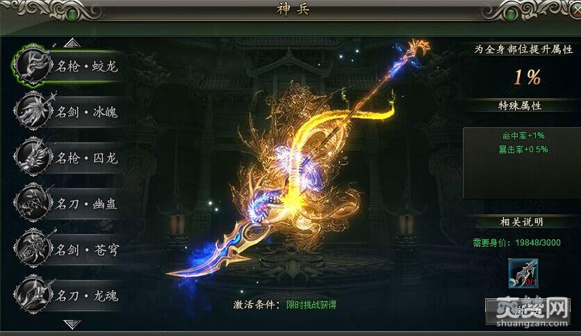 系统内一共拥有6把神兵,每把神兵都有酷炫的外观。根据神兵的不同,获得方式和激活的身价也不同。每把神兵都带有属性加成,并且每激活一把神兵所获得的特殊属性都是叠加的,所以激活越多神兵加成的特殊属性就越高。