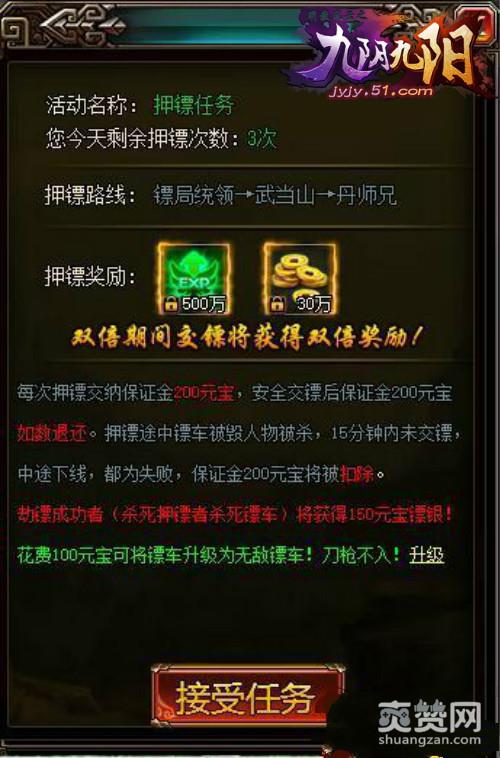 51《九阴九阳》中的押运镖车是游戏中日常任务之一,玩家若想要安全地完成押运过程需要强大的实力和良好的运气。可以在应天府的镖局统领处接取每日押镖任务,接取时需要缴纳一定的保证金,玩家在保证金充足的情况下接受任务就可以开始押镖了。