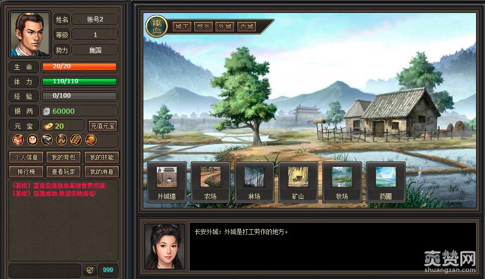 外城的打工场所包括采集粮食的农场,采集皮革与各种马匹的牧场,采集以及各种木质原材料的林场,采集以及各种原料矿石的矿山,采集各种药材类原材料的药圃。当然,玩家在外城打工场所打工的时候,可以选择获取产品或者获取工资。玩家选择或许工资,则本次打工所生产的产品都将存入打工场所的仓库,而打工场所则向玩家支付相应的工资;若玩家选择获取产品,则本次打工所得的产品都归玩家所有,但玩家需要向打工场所支付一定的金钱。部分打工可以获得的材料在市场上也能购买到,不过打工生产、打工场所仓库以及市场购买原材料的价格比为:1:2:4,因此究竟是索要工资还是获取产品就需要玩家自己来抉择了。