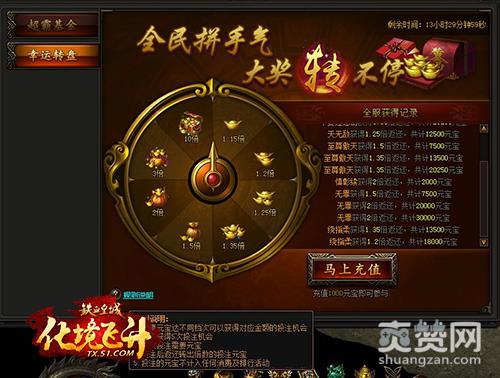 开启新服幸运转盘,“大尺度”回馈玩家。新服玩家充值元宝达到不同档次可获得对应金额的投注机会,每人最多获得5次投注机会,每次投注需要一定数值的元宝,转盘后会返还转出倍数的投注元宝,投注的元宝不计入任何消费和排行活动。此次转盘可是稳赚不赔的游戏玩法,最低返还115%的元宝,最高能够得到10倍的暴击,完全不需犹豫,暴富就在今天。
