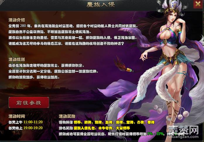 每天上午11:00-11:20以及 下午:19:00-19:20 ,击杀在渑池奔走破坏的魔族将士,获得抵御积分。全服累计积分达到一定分值,魔族会派出新一波魔主统帅。抵御的波数越多,获得收益越高。
