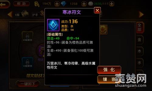 在游戏中,主公可以将符文镶嵌在自己的装备上,以增强装备的属性。每件装备都能够镶嵌金、木、水、火四个符文,其孔位分别在不同等级时解锁。在品质方面,符文则是分为绿、蓝、紫、橙四种,其中橙色等级最高,能够为主公提供最多的属性。此外,符文还能够进行强化升级,升级的材料即是符文本身,主公能够消耗那些不需要的低品质符文来对高品质的符文进行强化。