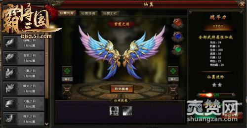 51《霸将三国》仙翼乃是彰显个性的绝佳系统,游戏初始就会送玩家一对仙翼,通过主界面下方的仙翼按钮进入界面佩戴。仙翼通过升星能够变得更加炫酷,同时可获得更多的属性加成。参加整点BOSS可获得大量升星石。每个仙翼都可以铸魂,通过铸魂可获得相应的属性加成,不过,仙翼铸魂并不是百分百成功,有一定的概率失败。还有仙翼幻化,参加游戏活动会获得特殊仙翼碎片,收集到指定数量的仙翼碎片,便可通过仙翼幻化获得特殊仙翼。