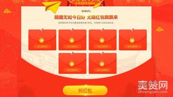 红包多多,惊喜多多!收到红包除了可以得到大把的钱,更意味着收获了新一年的好运和祝福。此次,360游戏准备了丰厚的红包给玩家发放。活动期间,在平台任意游戏内每充值100元即可获得1次拆红包机会,从1元到20元不等,拆开即可获得对应价值的360币,百拆百中,稳稳中奖。已获得的360币可以在平台下任意游戏内消费使用,是不是相当棒呢!