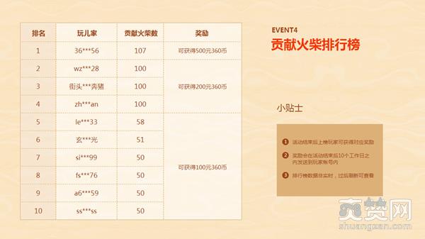 贡献火柴达到一定数量的玩家也可兑换相应价值的360币,贡献越多领取的360币也就越多!此外,贡献火柴数量排名最高的前10名玩家,还可以额外获得价值100元到500元不等的360币福利,绝对是一笔钱拆成N份花,让你的每一笔消费都有所值!还没有在榜的小伙伴们要加把劲儿呀!