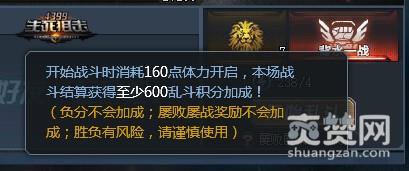 开启背水一战匹配时需要消耗160点体力,获得至少600点积分加成,一场战斗结束后消失,请谨慎使用。王者祝福可在结算时使用,可与背水一战连锁起效,享受超高加成!