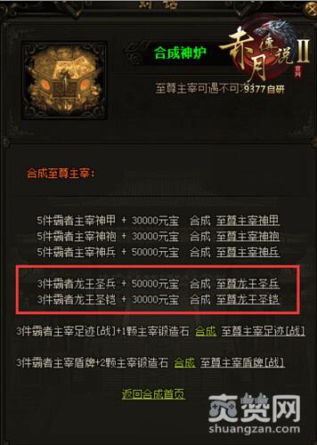 至尊龙王圣装合成将在9377《赤月传说2》开服90天之后在神炉处开放。在9377《赤月传说2》合成神炉处,至尊龙王圣兵由3件霸者龙王圣兵加50000元宝合成;至尊龙王圣铠则用3件霸者龙王圣铠加30000元宝合成。