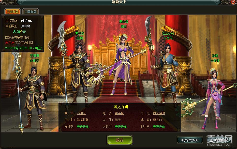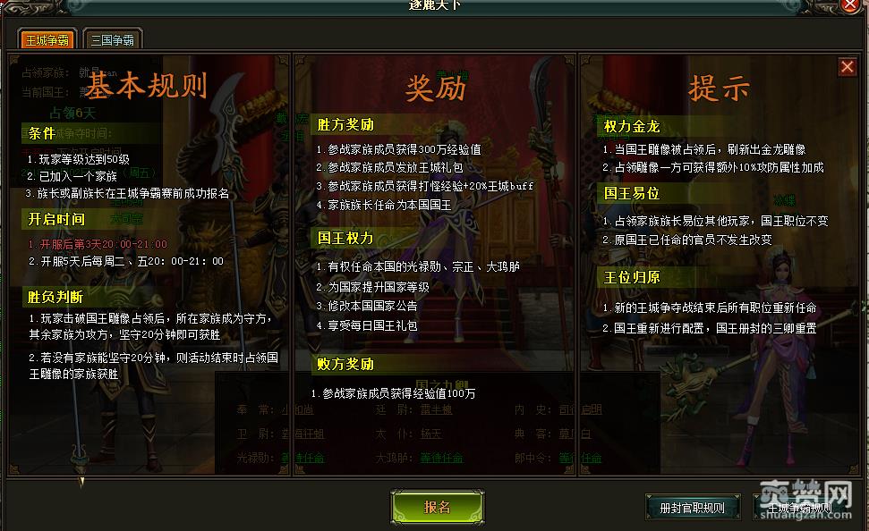 在ya247《我在三国》中,获得王城争霸胜利的家族族长任命为国王,战斗力最高前4名玩家任命为:丞相,大司马,大司空,大司徒;九卿中奉常,廷尉,内史,卫尉,太仆,典客由系统任命国家共享最高的6人;官职不可重复任职,优先任职最高职位,每日0点重新排列官职;家族战结束后官职称号需等待全服家族战结束后方授封称号。