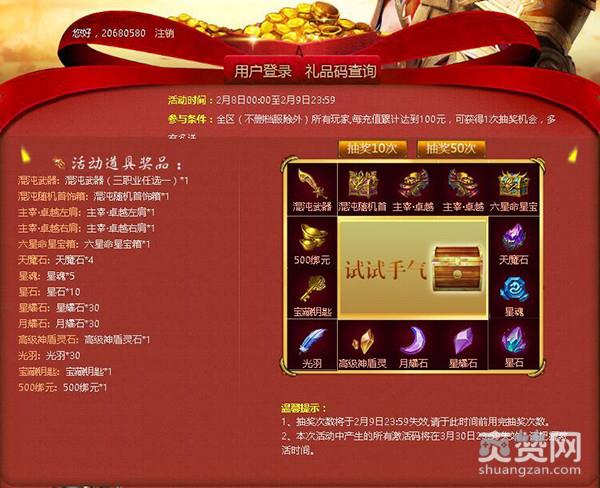 活动规则:全区所有满足条件的玩家,都可参与到幸运转盘活动中,拥有活动操作次数将于2月6日23:59失效,请在此时间前用完。本次活动中产生的所有激活码将在3月15日23:59失效,请把握激活时间。