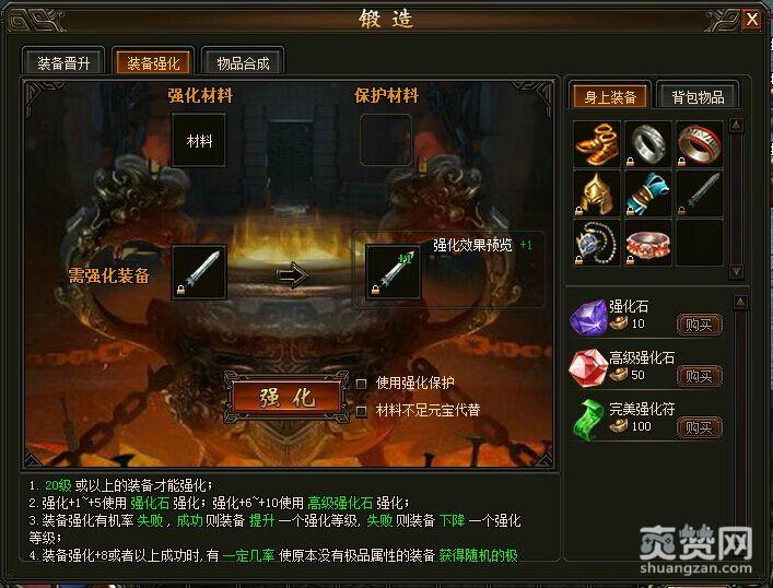 2、强化+1~+5使用强化石强化,强化+6~+10使用高级强化石强化;