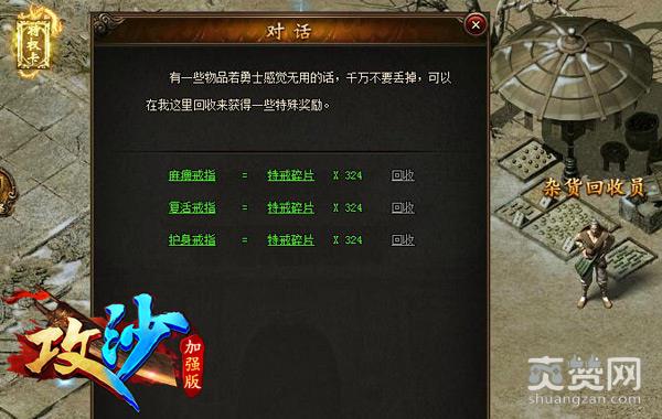 好不容易攒够特戒碎片拿到了珍惜的特戒,可是一看装备……我的亲舅姥爷,这个戒指已经有了……我换重复了怎么办?拿到市场去卖……价格要多少才配得上我这么辛苦……怎么办?现在有办法了!《攻沙》特派NPC杂货回收员,高额回收特戒: