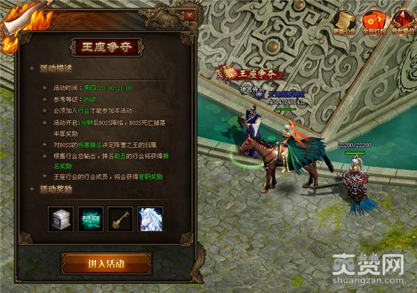 跨服王者的宝座只有一个,360uu《传奇世界》网页版王座争夺战已经开启,每周四晚准时开场的争夺等你加入,行会与行会之间的争夺,持续一个小时的激战,全服独有的寒冰独角兽等你来争夺!在王座争夺战中,强大的王座BOSS将降临战场,各大行会既要参与到与其他行会的血拼,更要努力击杀BOSS,系统将根据行会总输出来决出最后的排名,而获胜行会的成员们,也将获得专属官职奖励。与行会兄弟一起荣登王座,在新年之际写下最精彩的开场!