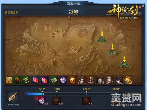 玩家在9377《神谕之剑》中,玩家右键点击藏宝图弹出坐标,选择其中一个前往,如此坐标为空,则选择另一个坐标继续寻宝。挖宝有几率遇到百晓生,赌神,封印塔,藏宝洞等。