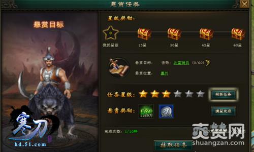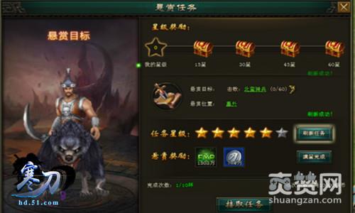 玩家在领取悬赏任务时,记得看清任务星数来领取。因为任务星数会影响到任务奖励收益,任务星数越高,任务奖励越丰厚。目前,寒刀悬赏任务满星为6星。玩家如不满意任务星级,可消耗银币对任务进行刷新,每次刷新消耗10000银币。或者大家直接花费10元宝,直接将任务满星完成的。当任务星级较低时,刷新还是很有必要的。玩家每天可完成10环悬赏任务,任务次数每日24点重置。玩家领取悬赏任务后,到指定地点击杀相应数量的怪物,就能完成任务,并获得一些经验值和银币奖励。