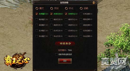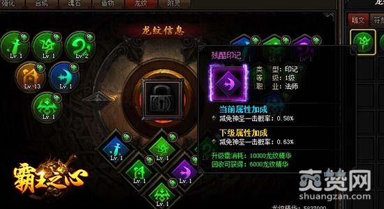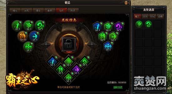 在9cb《霸王之心》的锻造功能中可以开启龙纹镶嵌界面,所有种类的龙纹均有绿、蓝、紫、橙等不同品质,品质越高属性越好。使用龙纹精华则可以升级龙纹,龙纹精华通过回收多余的龙纹获取。