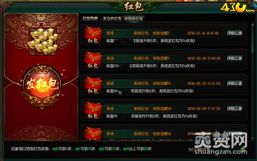 先来说说大家最爱的红包系统,玩家每天都要相应的抢红包次数,系统和玩家发送的红包有限,手快有,手慢无哈!当然发红包是无限制的,所以土豪请随意!每次发红包会消耗和红包金额等同的淘金额。而且红包只保留24小时,超时无法再抢哦!