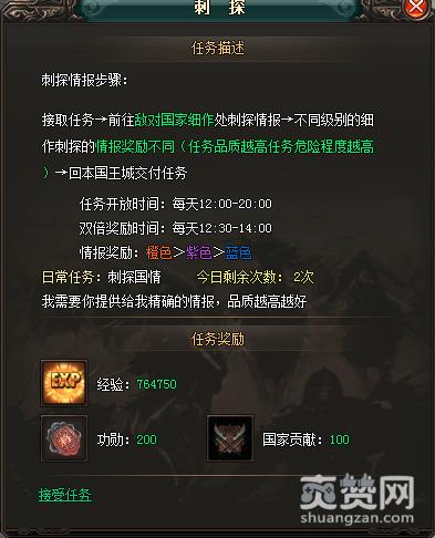 在2018年百变国战网页游戏《我在三国》中,每天12:30-14:00开启双倍刺探,70级及以上玩家可前往王城内NPC刺探校尉处接受刺探任务。任务级别分为橙色、紫色、蓝色三种级别。不同级别的细作刺探的情报奖励不同(任务品质越高危险程度也越高),领取任务后,根据任务提示前往敌对国家细作处刺探情报,找到并获取情报以后。回到本国王城处交付任务。