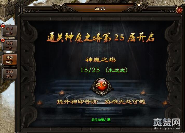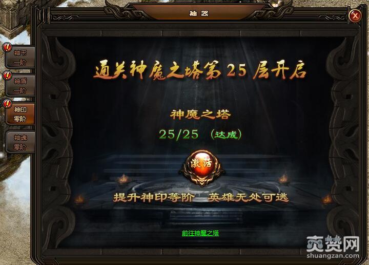 神印的激活条件是:通关神魔之塔第25层后开启。提升神印等阶的好处在于提升生命上限和物理攻击,英雄无处可逃。
