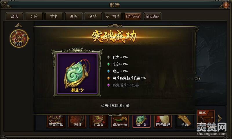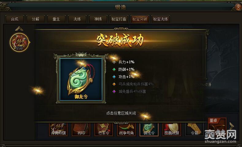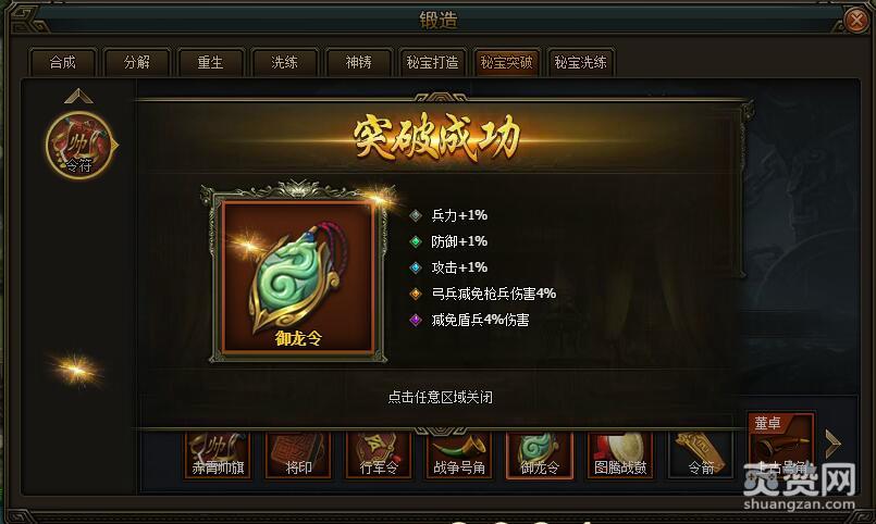 今天我们先依次选择锻造-秘宝突破-令符-普通-第五样令符御龙令,进行突破吧。