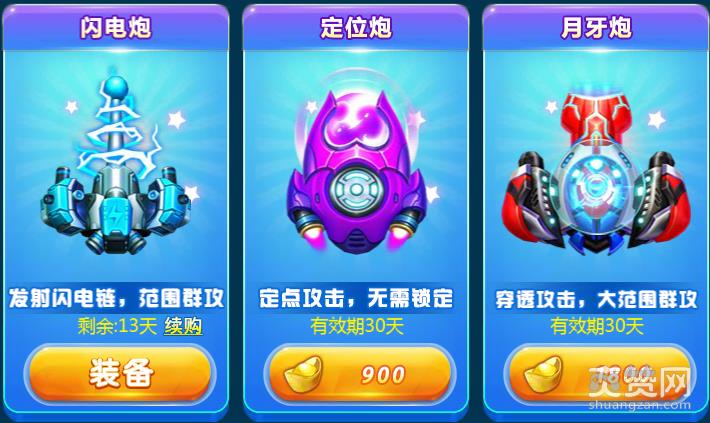 3、每种炮塔技能各不相同,回旋炮、闪电炮、月牙炮一炮弹可捕获多条鱼;