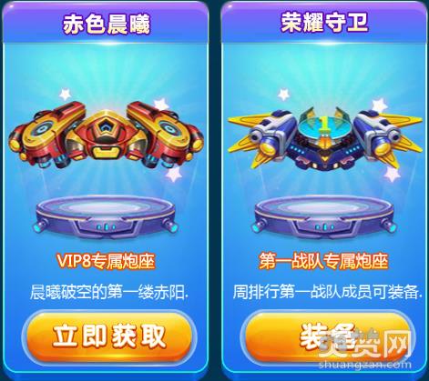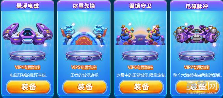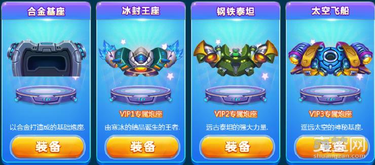 武器界面包括”炮塔“以及”炮座“,游戏内目前炮座有10种:“合金基座——基础炮座”、“冰封王座”、“钢铁泰坦”、“太空飞船”、“悬浮电磁”、“冰雪先锋”、“银铠守卫“、”电磁脉冲”、”赤色晨曦“、”荣耀守卫“,炮座通过充值VIP或加入周排行第一战队获得,达到相应VIP档次即可获得该档次炮座,炮座可在游戏内显示其外形。
