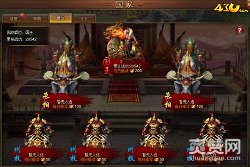 在国家中,玩家的爵位高低是按照声望来排序的,达到指定的官职就可为国王、丞相、州牧,独特的国家任务会在每天0点重置,每个任务完成只能领取一次奖励,转国后,已领取的奖励任务栏将不能再次领取,每完成一个任务还会获得国家经验哦!