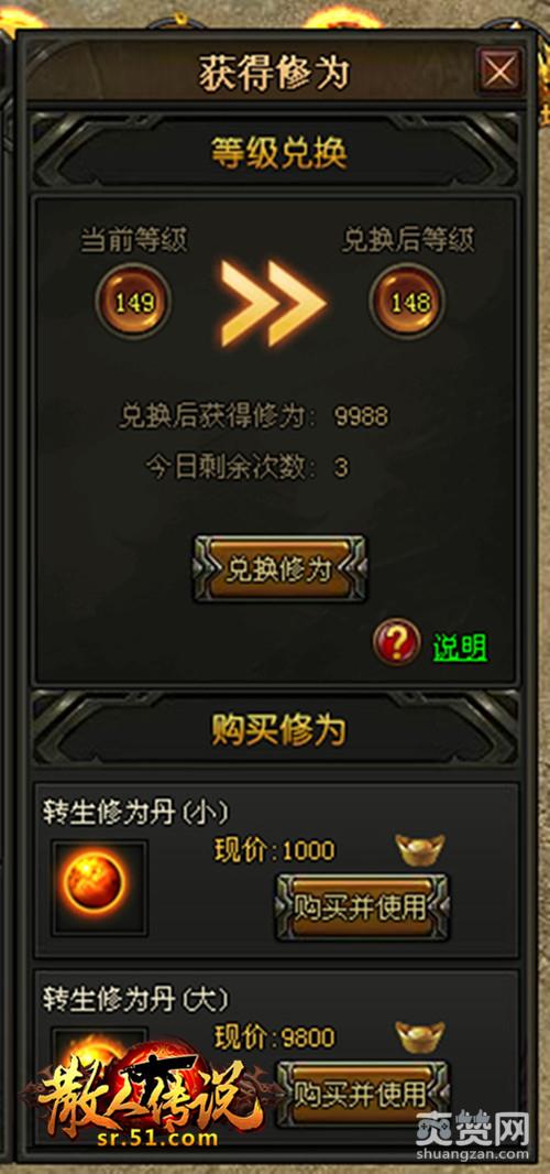 51《散人传说》如何获得修为值:人物达到80级以后可以降低自己的等级来兑换转生修为值,低于80级将不可降级兑换修为!每天限制兑换3次通过商城购买转生丹。