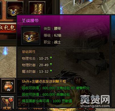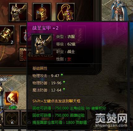 战圣宝甲+2。62级战士衣服。提欧物理攻击、物理防御以及魔法防御的略微增长。