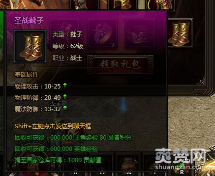 圣战靴子。62级战士鞋子。提欧物理攻击、物理防御以及魔法防御的略微增长。