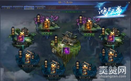 在每周一和周四的20:00-20:30,正是51《鸿蒙天尊》中的宗门领地战时间,只有等级达到90级的玩家的方可参与其中。此活动以宗门为单位,成功占领领地旗帜后则该领地归属宗门所有,宗门成员可领取领地奖励。领地中的旗帜可被宗门宗主以及四位护法采集,采集成功,则旗帜归宗门所有。旗帜有归属后,其他宗门成员可攻击旗帜,摧毁时,伤害排名第一的宗门有15秒优先采集权。活动结算时,旗帜归属的宗门,拥有该领地。宗门在战场活动中,若连续持有旗帜时间满15分钟,则该领地的战旗将不能再被攻击,被该宗门永久持有,但每个宗门最多可占有两块领地。