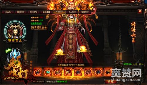 世界BOSS,目前整个鬼吹灯最强大的BOSS,因为这个BOSS精绝女王、冥府灵王,是目前能够掉落9转和10转装备的强大BOSS,也就是更新后的终极装备,每天能够刷新1次,每天晚上22点30分钟,基本上在线的玩家全部都会参与世界BOSS,只要参加这个活动就能够获取一定的奖励。