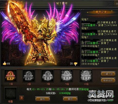 膜拜城主还可进行刷新,每天均有免费刷新次数,用完后可通过消耗50绑定元宝进行一次刷新,刷新有几率提升膜拜奖励倍数,最高可获得10倍奖励,也可花费100元宝直接一键获得10倍经验效果。每次膜拜鄙视可获得大量经验奖励,还有机会获得礼包,一键十倍必出礼包。