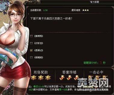 923yx《烈火战神》中的智力答题分为两种,一种是免费的,一种是金币的,两种答题每一轮答题的题数都为30题。每次答题都可以获得一定的经验和文采值,题目难度越大,奖励就越高。如果在答题前使用双倍奖励的话,那么大家还可以获得本题的两倍积分。