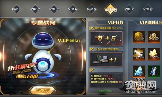 《4399生死狙击》全新VIP系统正式于广大玩家见面,只要累积充值金币达到对应“VIP等级”即可获得海量特权豪礼,更多详情可点击游戏内“左上角”-“VIP标识”查看了解。想要获得战宠V.I.P需要玩家达到VIP6解锁购买哦。